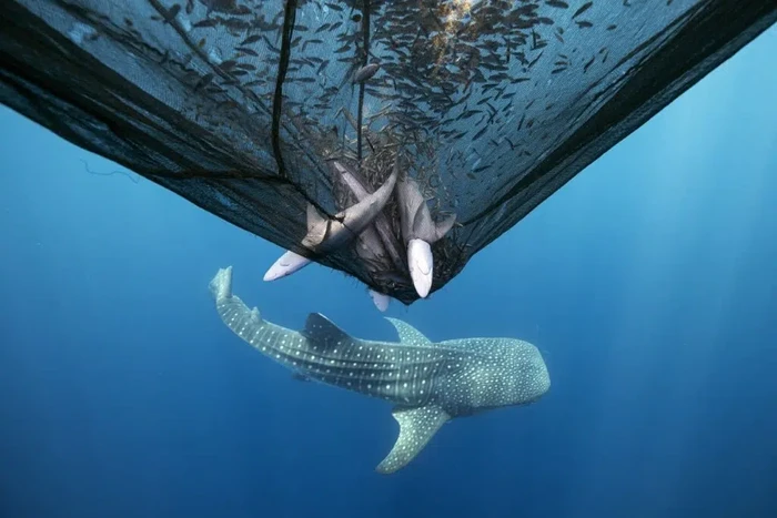 βSaya mengabadikan gambar ini di Papua Barat, di mana tiga hiu mati di jaring ikan teri. Di dekatnya, sirip ekor hiu paus yang terpotong setengah menceritakan kisah menyedihkan lainnya tentang dampak manusia. Hiu sangat penting bagi keseimbangan laut, namun kita justru mendorong mereka menuju kepunahan. Momen ini adalah permohonan diam-diam: untuk melihat hiu bukan sebagai bahaya, melainkan sebagai spesies yang terancam punahβdan layak diselamatkan.β Foto: Ocean Photographer of the Year