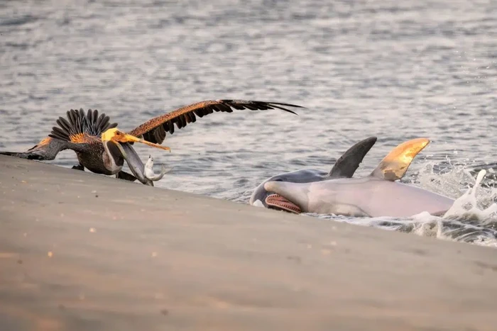 βPelikan biasanya mengintai di dekatnya, berharap memanfaatkan mangsa yang mudah. Mengikuti pelikan biasanya merupakan indikator yang baik untuk mengetahui di mana di sepanjang pantai lumba-lumba akan terdampar selanjutnya. Meskipun ada sekitar 350 lumba-lumba yang menjadikan Carolina Selatan sebagai rumah mereka, perilaku mencari makan di pantai yang langka ini hanya dilakukan oleh beberapa anggota dari satu kawanan.β Foto: Ocean Photographer of the Year