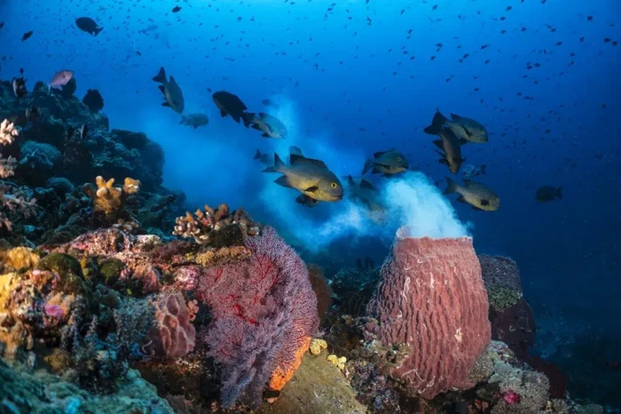 Fotografer: Aaron Sanders Kategori: Harapan Lokasi: Indonesia βAwan telur putih mengepul dari spons barel raksasa, sebuah peristiwa langka dan cepat berlalu yang menghembuskan kehidupan baru ke terumbu karang. Di sekitar spons, Midnight Snapper yang hiruk pikuk, berpesta dengan gumpalan yang membubung. Mulut menganga para pemakan oportunis ini bergantian memakan telur yang kaya nutrisi, terjun ke awan putih, melahap diri mereka sendiri. βMengambil gambar ini bukanlah tugas yang mudah,β kata Sanders.Β Foto: Ocean Photographer of the Year