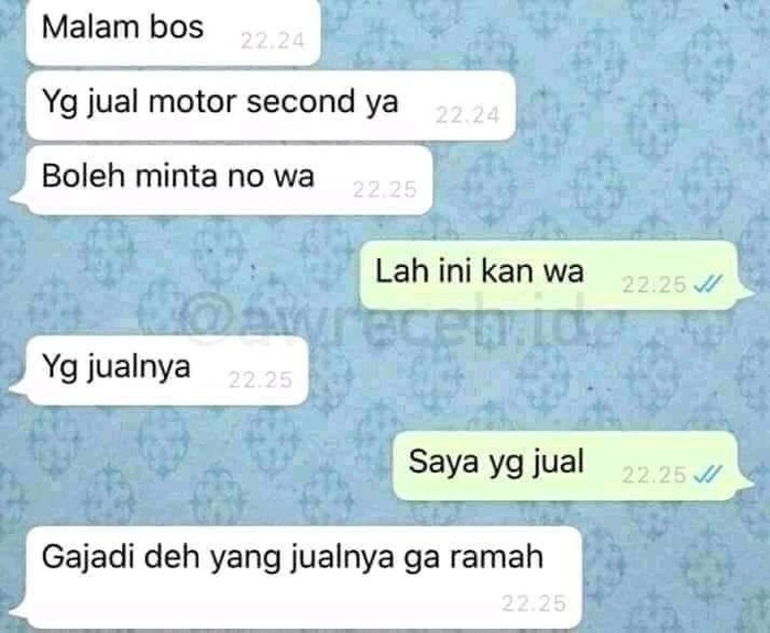 FotoINET Kumpulan Chat Cringe Lucu Netizen, Bikin Ngakak Sampai Geli Pool - detikInet Sabtu, 23 Agu 2025 07:45 WIB Tautan telah disalin Jakarta - Kumpulan chat cringe lucu netizen ini bikin ngakak sekaligus geli. Dari salah paham sampai chat absurd, semuanya dijamin kocak! Dari salam memang bikin cringe... Foto: X.com Perkara babi. Foto: X.com Pamit setelah tidak kuat sekolah online. Foto: X.com Perkara balasan kurang ramah. Foto: X.com Chat tidak jelas Foto: X.com Urusan beda agama... Foto: X.com Sender mungkin tengah mencoba menulis cerita fiksi. Foto: X.com Perkara tidak jadi mati. Foto: X.com Urusan akad. Foto: X.com Muka bapak ngeselin... Foto: X.com (/) TAGS fotoinet fotodetikcom LIHAT LAINNYA Tautan telah disalin