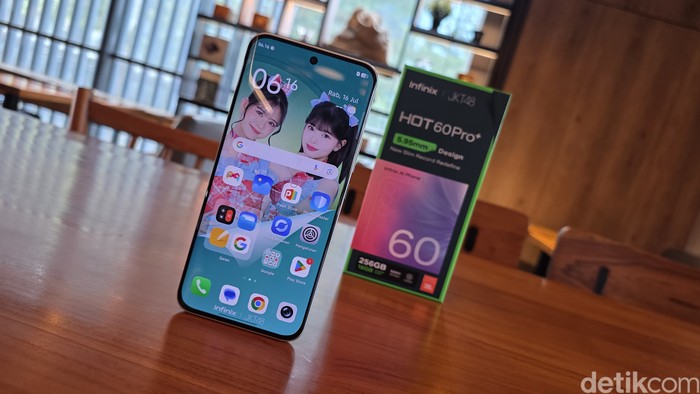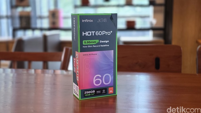Inilah kemasan Infinix Hot 60 Pro Plus. Bagian atasnya terdapat tanda kolaborasi dengan JKT48. Foto: Adi Fida Rahman/detikINET