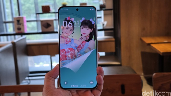 JKT48 menghiasi layar AMOLED berukuran 6,78 inch dengan resolusi 1,5K, refresh rate 144Hz, tingkat kecerahan hingga 4.500 nits, dan fitur Eye Comfort Protection. Foto: Adi Fida Rahman/detikINET
