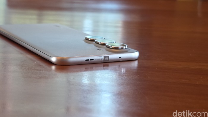 Bagian atas terdapat tanda kalau speaker HP ini diberikan sentuhan JBL.Foto: Adi Fida Rahman/detikINET