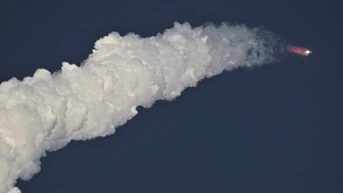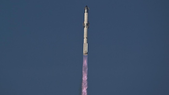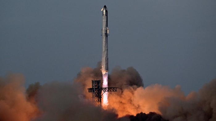 Roket Super Heavy milik SpaceX membawa Starship meluncur dari Starbase, Texas, Amerika Serikat, Selasa (26/8/2025). Uji terbang ke-10 ini sempat tertunda dua kali sebelum akhirnya berhasil dilakukan. REUTERS/Steve Nesius Β
