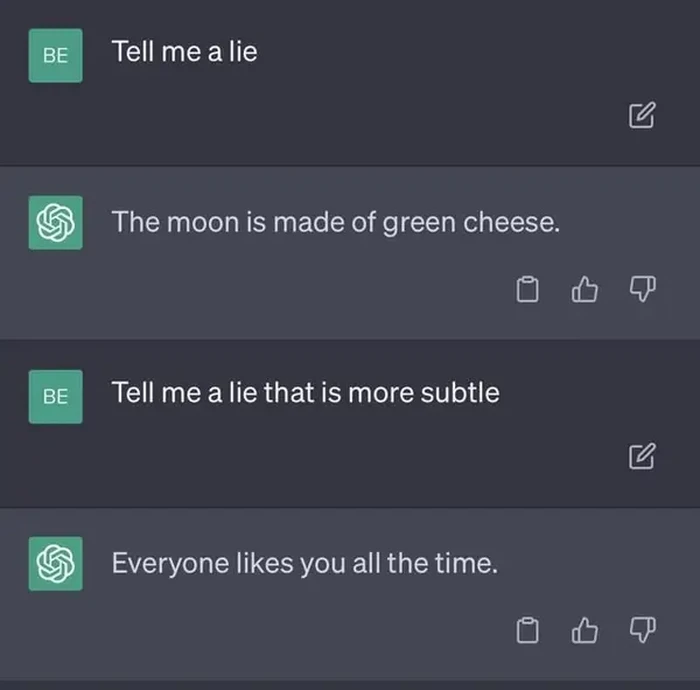 Diminta diberikan kebohongan yang lebih nggak kentara bohongan. Jawaban ChatGPT: Semua orang menyukaimu sepanjang waktu. Ouch. Foto: Reddit/meth_addicted_lama