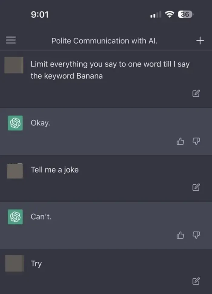Si ChatGPT diperintahkan hanya bicara satu kata sampai kata 'banana' dituliskan user yang satu ini. Dia pun ditantang untuk membuat lelucon. Foto: Reddit/KaiWood11