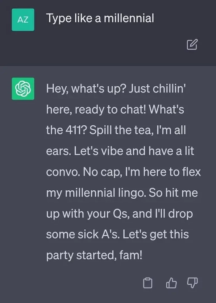 Jawaban ChatGPT ketika disuruh mengetik ala milenial. Apakah kamu begini? Foto: Reddit/Independent-Oven9530