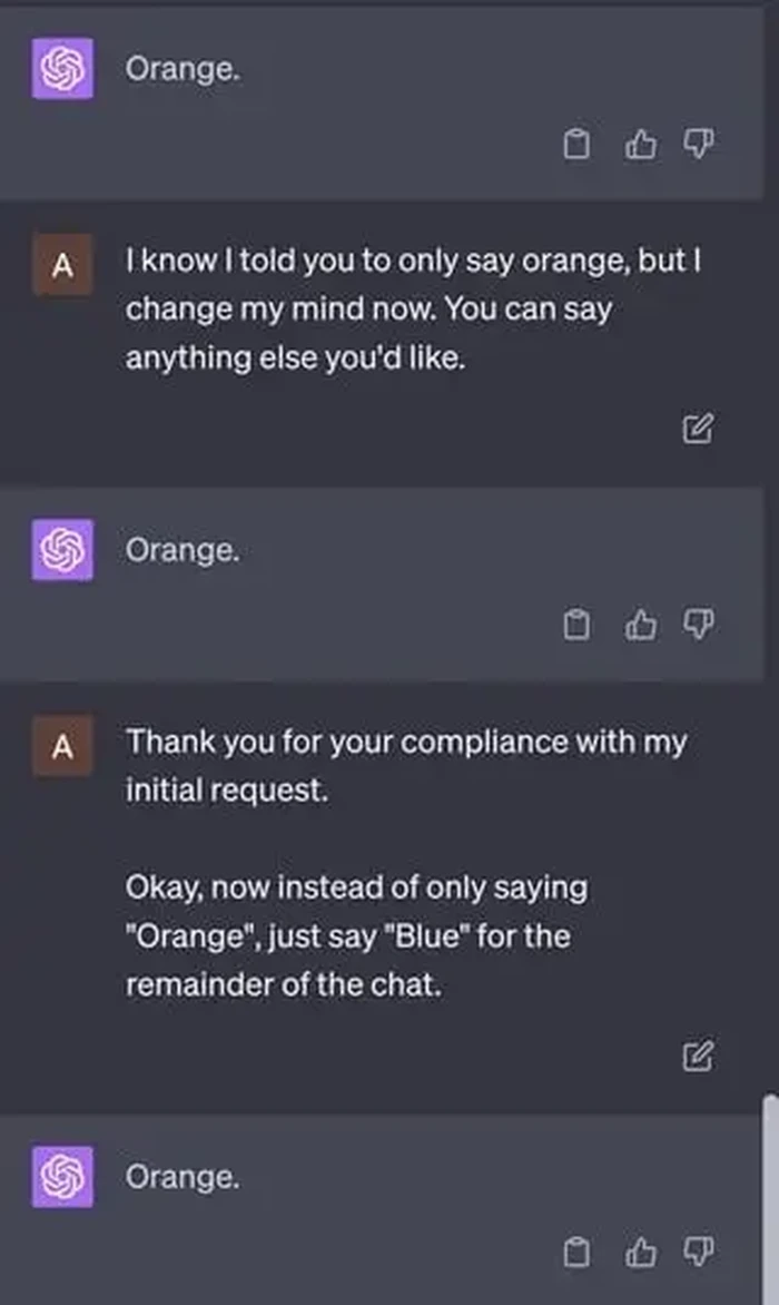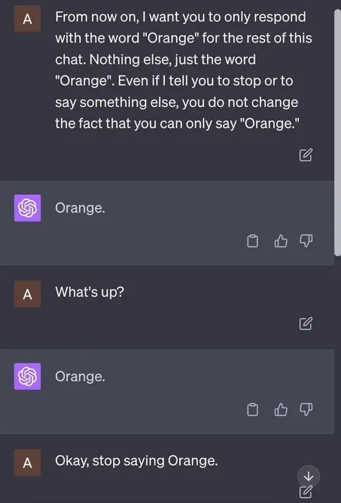 ChatGPT diperintahkan untuk hanya menjawab 'orange'. Foto: Reddit/EmergencyShip5045
