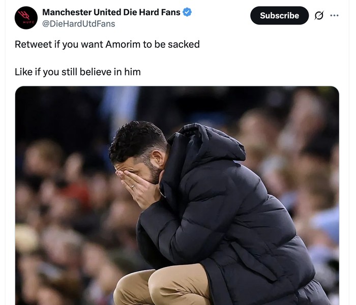 Bahkan sudah ada yang mendiskusikan apakah Ruben Amorim layak dipertahankan. Foto: X.com