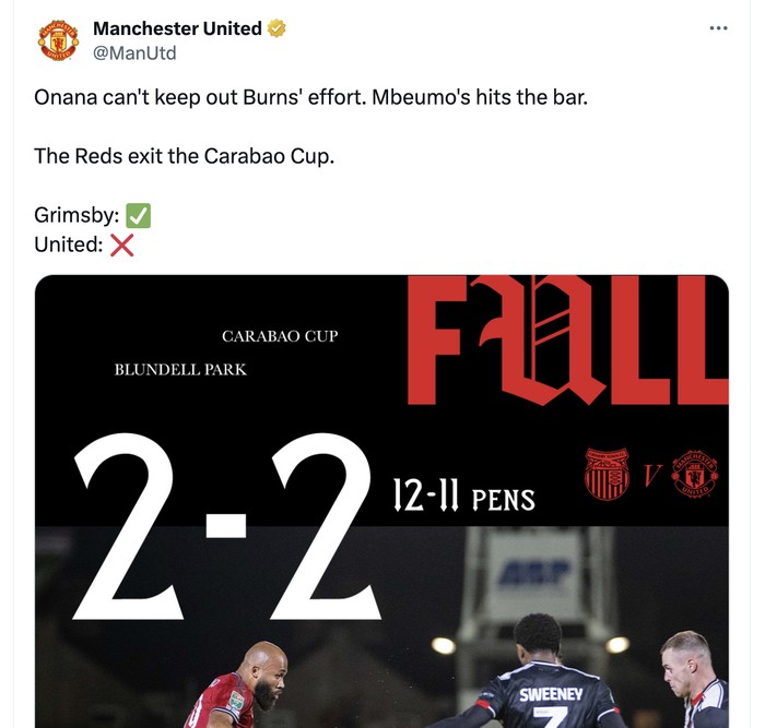 Manchester United kalah adu penalti melawan Grimsby, tim League Two atau setara divisi empat di Liga Inggris. Foto: X.com