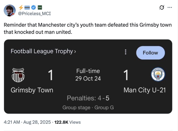 Bahkan tim muda Manchester City bisa menang lawan Grimsby, tapi tim utama MU tidak. Foto: X.com