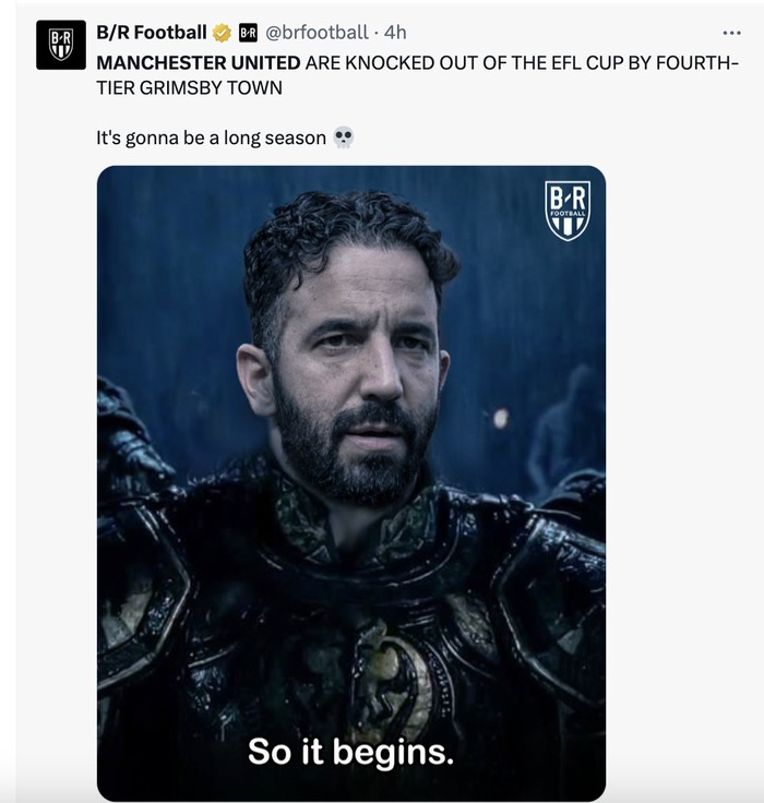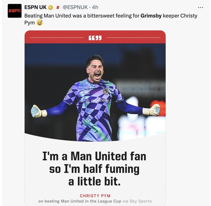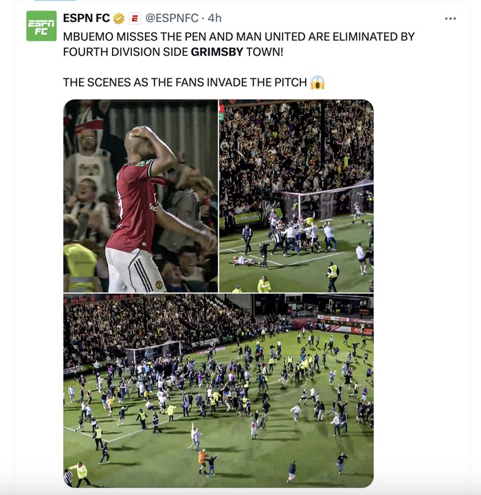 "Tim divisi keempat Grimsby Town mengeliminasi MU dari Carabao Cup," tulis Fabrizio Romano. Foto: X.com