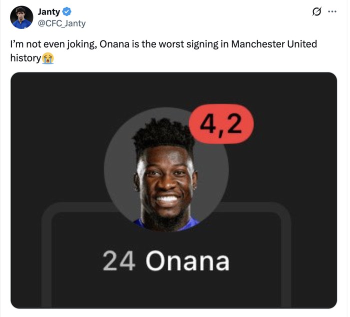 Blunder Andre Onana membuatnya dinilai rendah dalam laga semalam. Foto: X.com