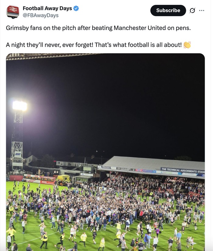 Fans Grimsby langsung memenuhi lapangan usai melibas MU. "Malam yang tidak akan pernah mereka lupakan," tulis akun ini. Foto: X.com
