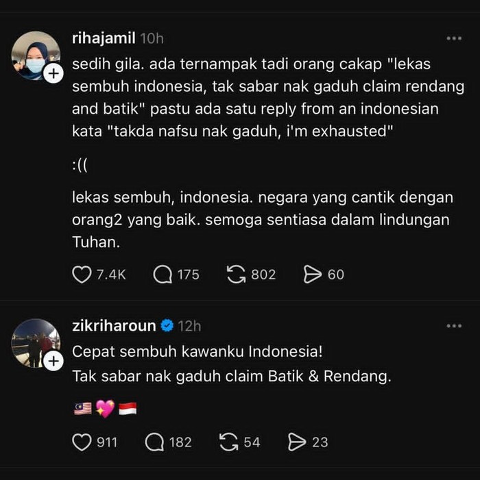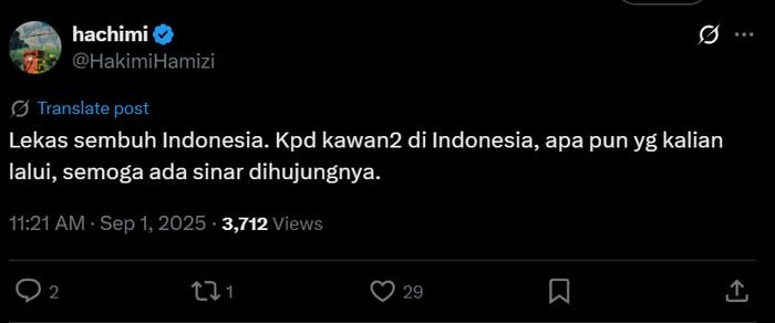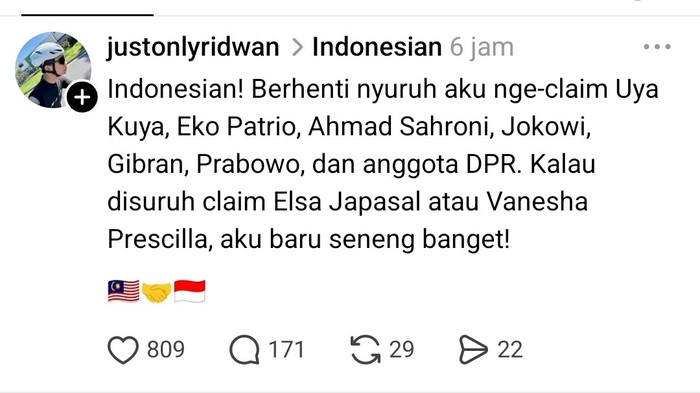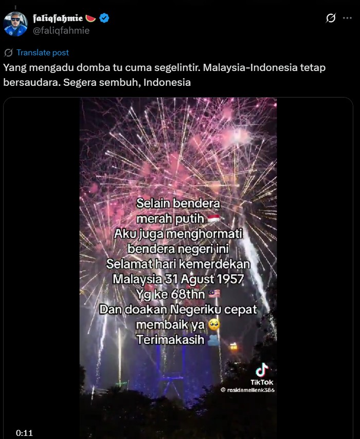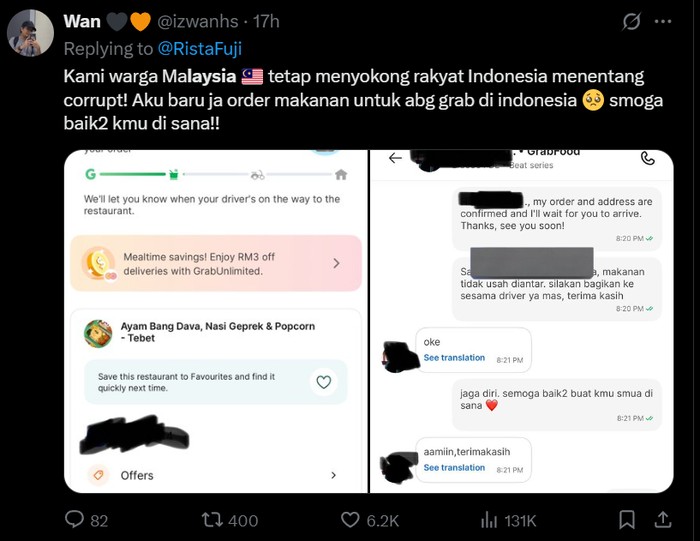 FotoINET Dukungan Rakyat Malaysia untuk Indonesia, Pesan Makanan untuk Ojol Aisyah Kamaliah - detikInet Senin, 01 Sep 2025 16:03 WIB Tautan telah disalin Jakarta - Meski kadang berselisih karena masalah rendang, netizen Indonesia dan Malaysia sebenarnya tetap akur loh. Ini buktinya. Salut banget untuk sahabat kita di Malaysia, terima kasih! Foto: X/izwanhs Tak cuma satu dua orang, ada banyak yang melakukannya juga. Foto: X/nahz_oaix "Sending love from Malaysia. Ada yang nak bagi untuk isteri and ada juga yang nak tolong agihkan untuk orang lain," ujar @brgsjks. Foto: X/brgsjks Berbagi di tengah aksi yang tengah memanas di Indonesia. Foto: X/brgsjks Lekas sembuh Indonesia. Foto: X/HakimiHamizi Indonesia dan Malaysia adalah saudara serumpun. Tetap jaga kerukunan. Foto: X/faliqfahmie Kalau membuat kamu merasa lebih baik, ya udah. Foto: X/hachuq Gaduh-gaduh antar saudara yang dirindukan. Foto: X/rihajamil Mau ngeklaim juga pilih-pilih, aowkaowk. Foto: X/justonlyridwan Meme yang lagi beredar di medsos. Akur-akur ya, Malaysia dan Indonesia! Foto: X/mametchxi (/) TAGS fotoinet indonesia-malaysia hubungan indonesia-malaysia fotodetikcom LIHAT LAINNYA Tautan telah disalin