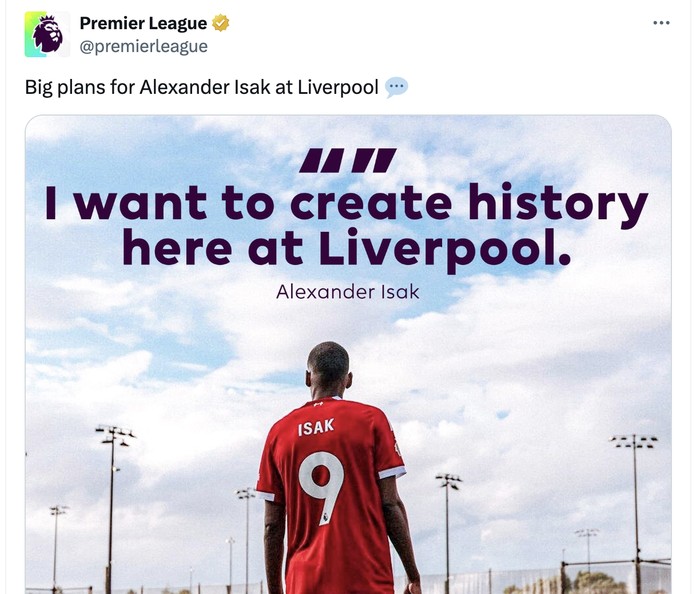 "Sata ingin menciptakan sejarah di sini, di Liverpool," kata Isak. Foto: X.com