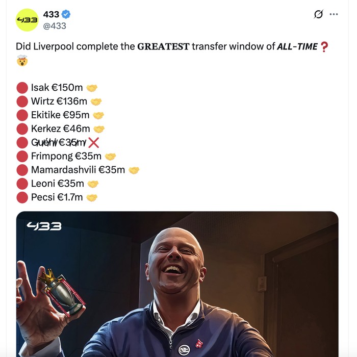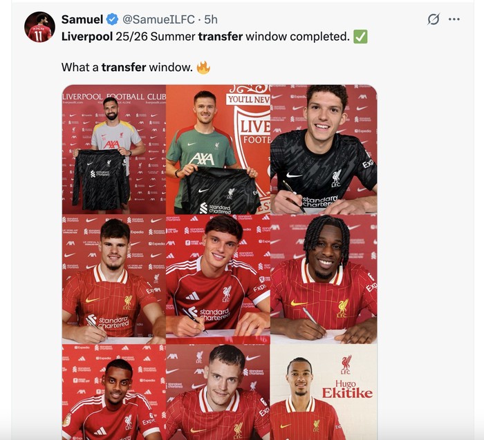 Dengan belanja segila ini, apakah musim transfer Liverpool kali ini adalah yang terbaik dalam sejarah? Foto: X.com