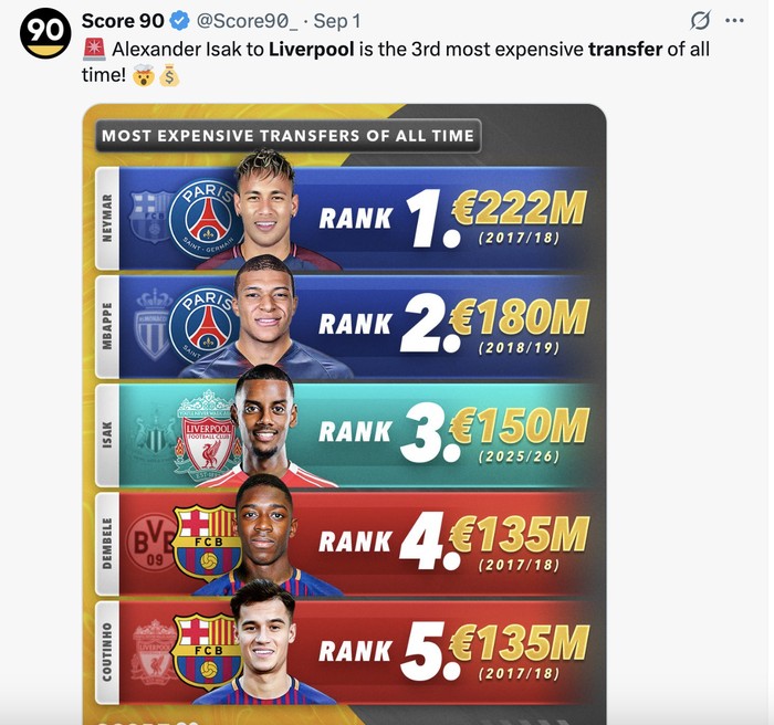 Dengan mahae sekitar 150 juta euro, Isak adalah pemain termahal ketiga sepanjang sejarah. Foto: X.com