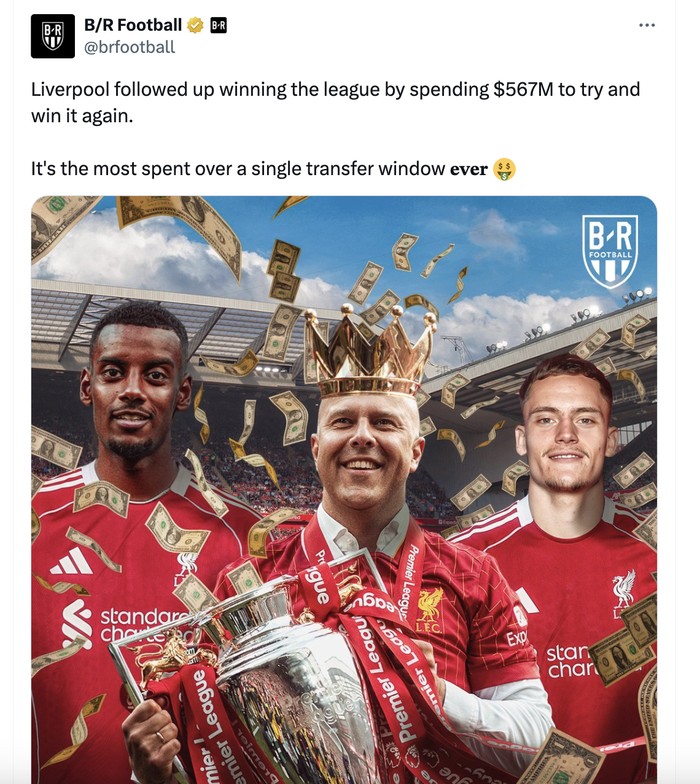Sudah juara Liga Inggris, Liverpool menggelontorkan begitu banyak uang untuk jadi juara lagi musim ini. Foto: X.com