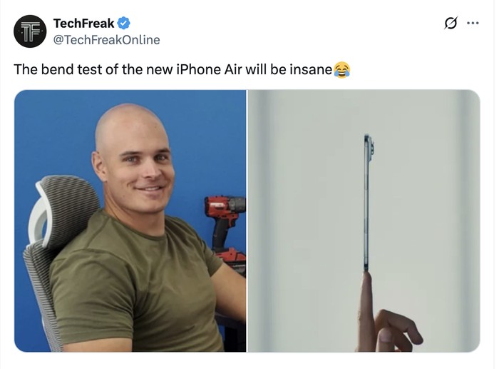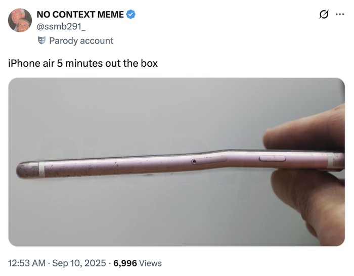 iPhone Air diklaim tangguh oleh Apple, tapi tetap saja jadi bahan meme seperti ini, yaitu mudah rusak saking tipisnya. Foto: X.com