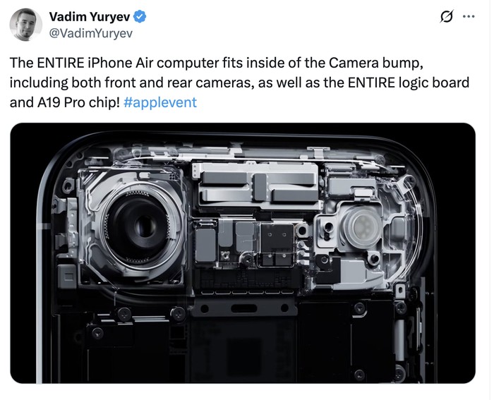 Jeroan iPhone Air di mana komponennya mayoritas berada di bagian atas. Foto: X.com