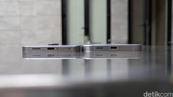 Galaxy S25 FE (kiri) juga memiliki bodi yang lebih tipis dan ringan dibandingkan Galaxy S24 FE (kanan) dengan ketebalan 7,4mm dan bobot 190 gram. Foto: Virgina Maulita Putri/detikINET