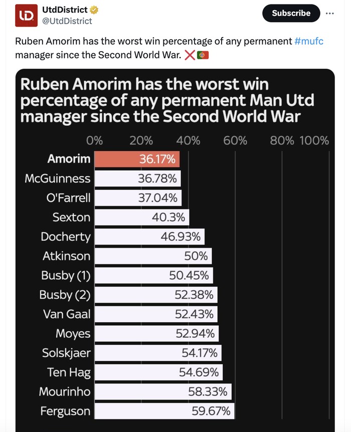 Persentase kemenangan Amorim di MU paling rendah sepanjang sejarah dibanding pelatih lainnya. Foto: X.com
