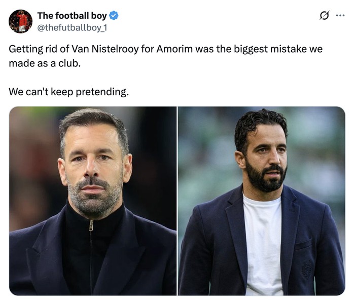 Akun ini menilai dulu lebih baik mempertahankan Ruud van Nistelrooy daripada merekrut Amorim sebagai pelatih. Foto: X.com