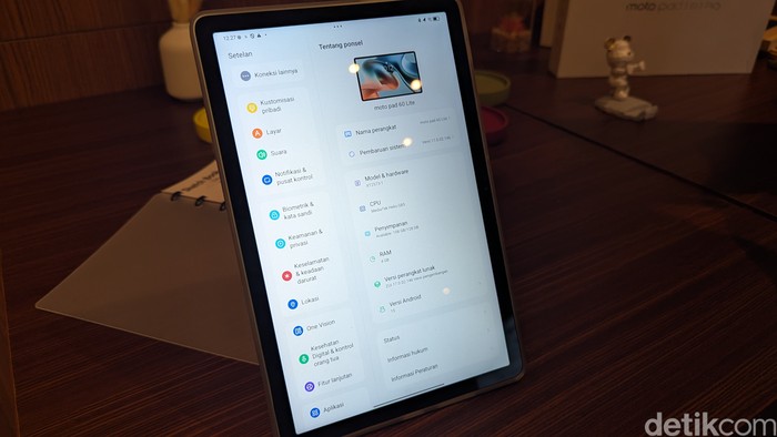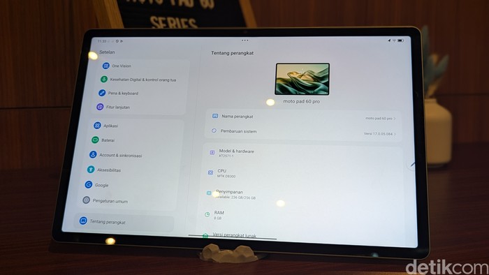 Spesifikasi inti Moto Pad 60 Pro. Tablet ini diotaki chipset MediaTek Dimensity 8300 dengan RAM 8GB dan memori internal 256GB yang dapat diperluas hingga 1TB dengan slot microSD. Foto: Virgina Maulita Putri/detikINET