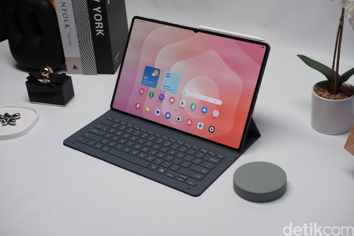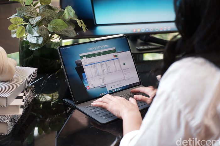 Dengan Book Cover Keyboard Slim yang dilengkapi Galaxy AI Key, Galaxy Tab S11 Series bertransformasi menjadi workstation mobile yang ideal untuk presentasi, pengeditan dokumen, atau bekerja saat bepergian. Foto: Adi Fida Rahman/detikINET