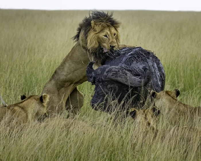 Seekor singa jantan dewasa berada di punggung seekor kerbau Cape sementara singa betina menghalangi jalannya. Foto: Discoverwildlife