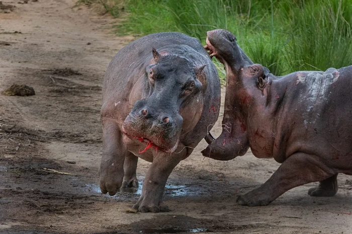 Dua kuda nil, Hippopotamus amphibius, bertarung satu sama lain di darat, satu dengan rahang terbuka lebar, yang lain dengan mulut dan sisi tubuh berlumuran darah. Foto: Discoverwildlife