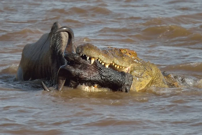 Wildebeest berjanggut putih barat (Connochaetes taurinus mearnsi) di rahang Buaya Nil (Crocodylus niloticus) di sungai, Segitiga Mara, Cagar Alam Nasional Maasai Mara, Narok, Kenya Foto: Discoverwildlife