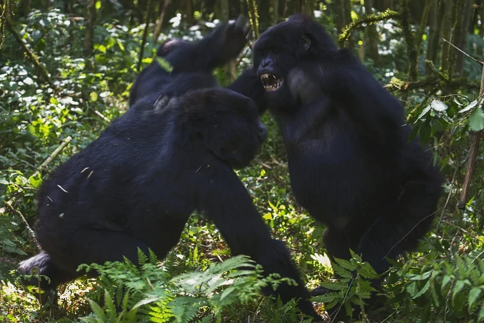 Sepasang gorila gunung punggung hitam (Gorilla beringei beringei) bermain dan bertarung di hutan, Parc de Volcanos, Rwanda/Kredit: Getty Images Foto: Discoverwildlife