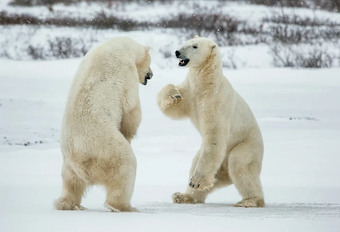 Beruang kutub (Ursus maritimus) berkelahi di atas salju. Tundra Arktik, Kanada. Foto: Discoverwildlife