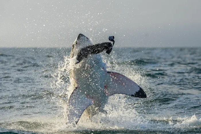 Hiu Putih Besar (Carcharodon carcharias) melompat saat diserang Foto: Discoverwildlife