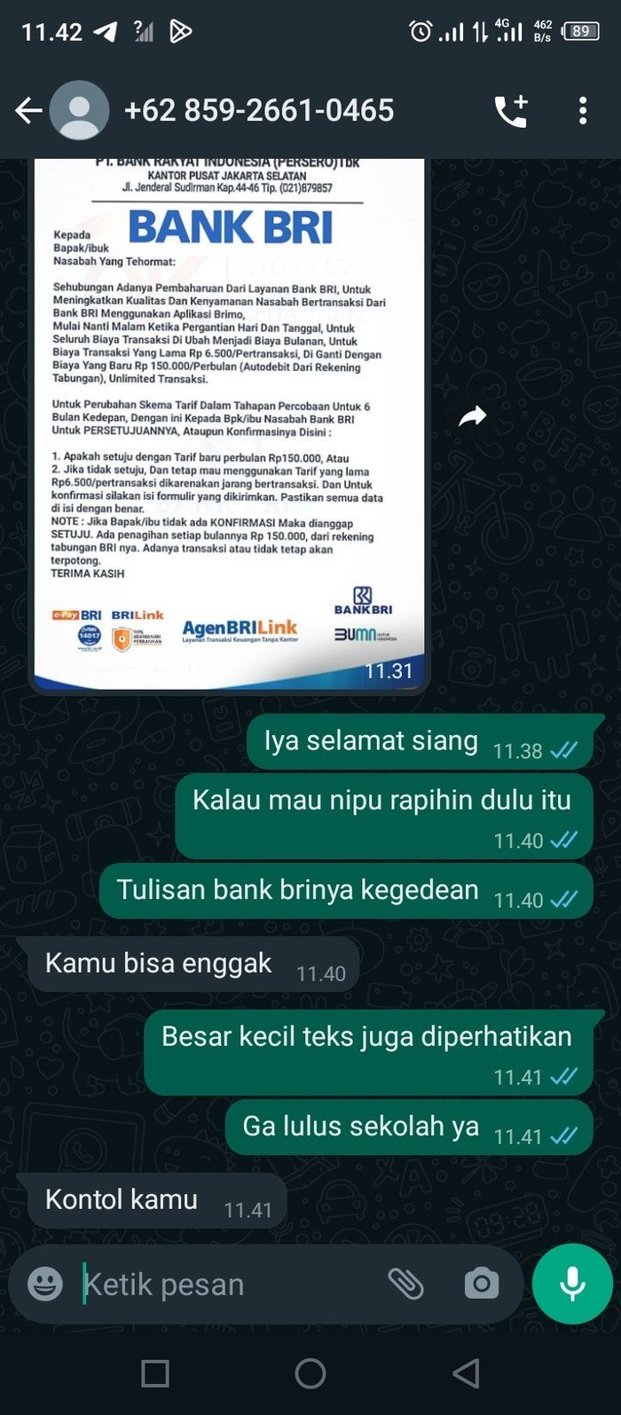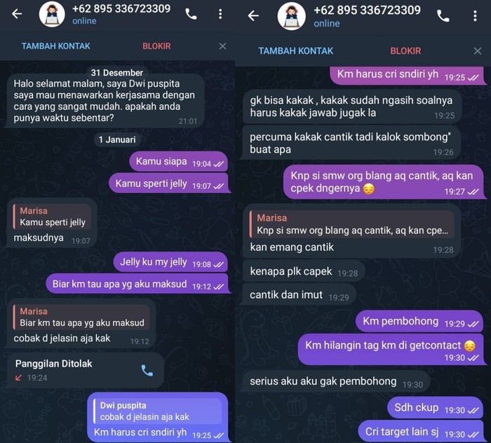 FotoINET Chat WhatsApp Penipu Online Ini Bikin Marah hingga Ngakak Pool - detikInet Sabtu, 04 Okt 2025 11:45 WIB Tautan telah disalin Jakarta - Percakapan Chat WhatsApp penipu online ini bikin warganet campur aduk, dari marah sampai ngakak baca balasan kocaknya! Kartu jadi puzzle. Foto: X.com Suratnya dikoreksi agar tidak typo.Β Foto: X.com Saling adu mulut. Foto: X.com Ketika penipu ngegombal. Foto: X.com Penipu langsung emosi. Foto: X.com Dikasih masukan malah emosi. Foto: X.com Diajarin ngedit dokumen oleh calon korban. Foto: X.com Penipunya malah curhat. Foto: X.com Pelaku dan calon koran saling curhat. Foto: X.com Balasan yang bikin tidak berkutik. Foto: X.com Dibalas pakai bahasa India. Foto: X.com Lupa bahasa Jawa karena tinggal di New York. Foto: X.com Bukan 2 juta rupiah tapi ringgit. Foto: X.com Dibalas dengan sebuah nasihat. Foto: X.com (/) TAGS fotoinet fotodetikcom LIHAT LAINNYA Tautan telah disalin