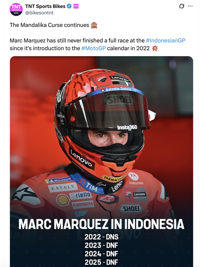 Akun ini menyebut kutukan Mandalika berlanjut di mana Marc Marquez tidak pernah menyelesaikan balapan secara penuh di sirkuit ini. Foto: X.com