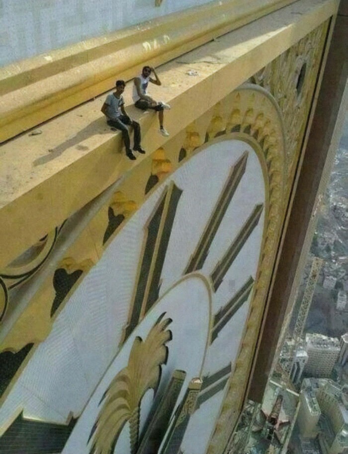 Dua Orang Duduk di Menara Jam Abraj Al Bait di Mekkah Foto: Boredpanda