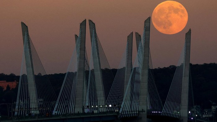 Bulan super pertama tahun ini, dikenal sebagai Harvest Moon, tampak terbit di atas Jembatan Mario Cuomo yang membentang di Sungai Hudson, Grandview, New York, Amerika Serikat, Senin (6/10/2025). Fenomena ini menjadi penanda kedekatan posisi Bulan dengan Bumi sehingga tampak lebih besar dan terang dari biasanya. REUTERS/Mike Segar Β