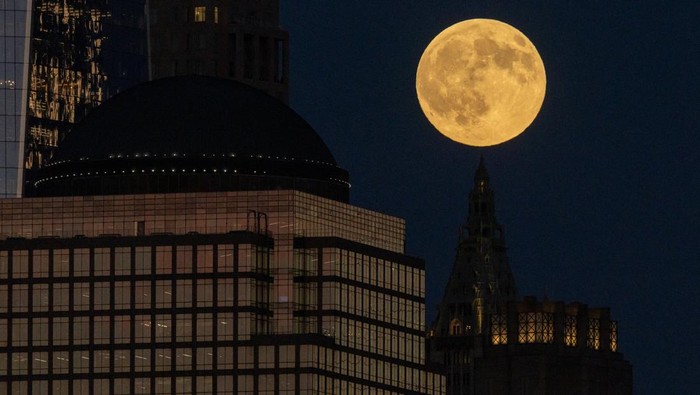 Harvest Moon, supermoon pertama tahun ini, terlihat muncul di atas kawasan Lower Manhattan dari Jersey City, New Jersey, Amerika Serikat, Senin (6/10/2025). Bulan tampak lebih besar karena berada di titik terdekatnya dengan Bumi. REUTERS/Kylie Cooper Β