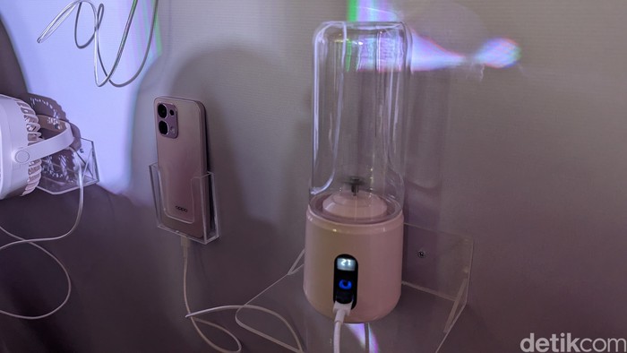 Baterai ini mendukung pengisian cepat SuperVOOC 80W dan dapat dipakai mengisi daya perangkat lain, termasuk blender portabel, menggunakan fitur reverse wired charging. Foto: Virgina Maulita Putri/detikINET