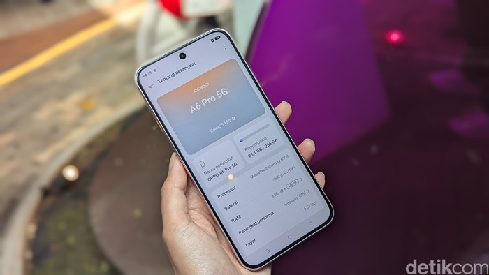 Spesifikasi inti Oppo A6 Pro 5G. Ponsel ini diotaki chipset MediaTek Dimensity 6300 dengan RAM 8GB dan memori internal 256GB. Foto: Virgina Maulita Putri/detikINET