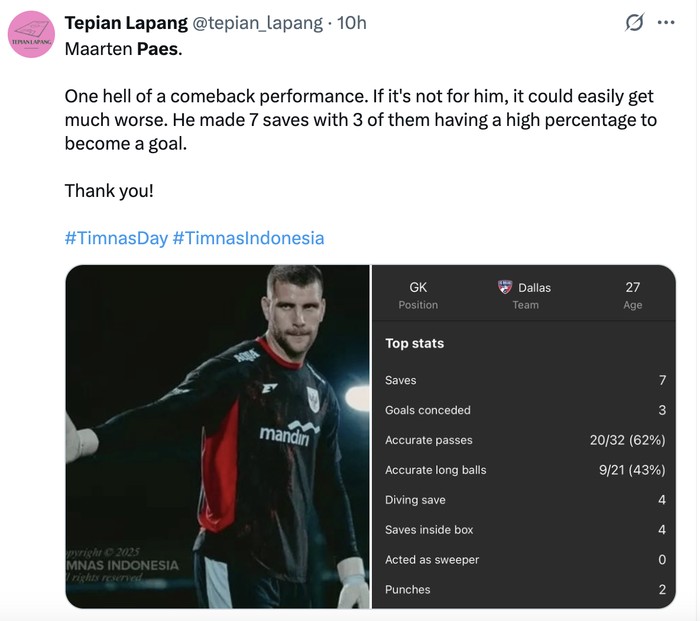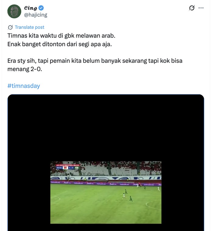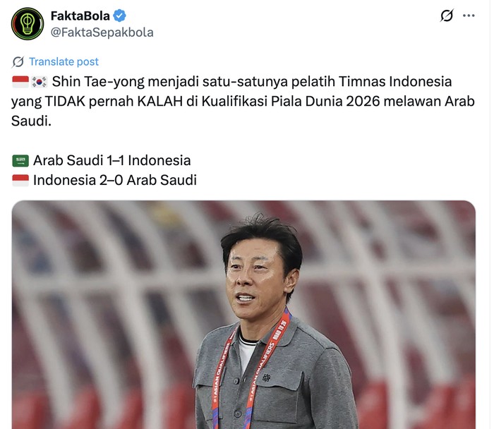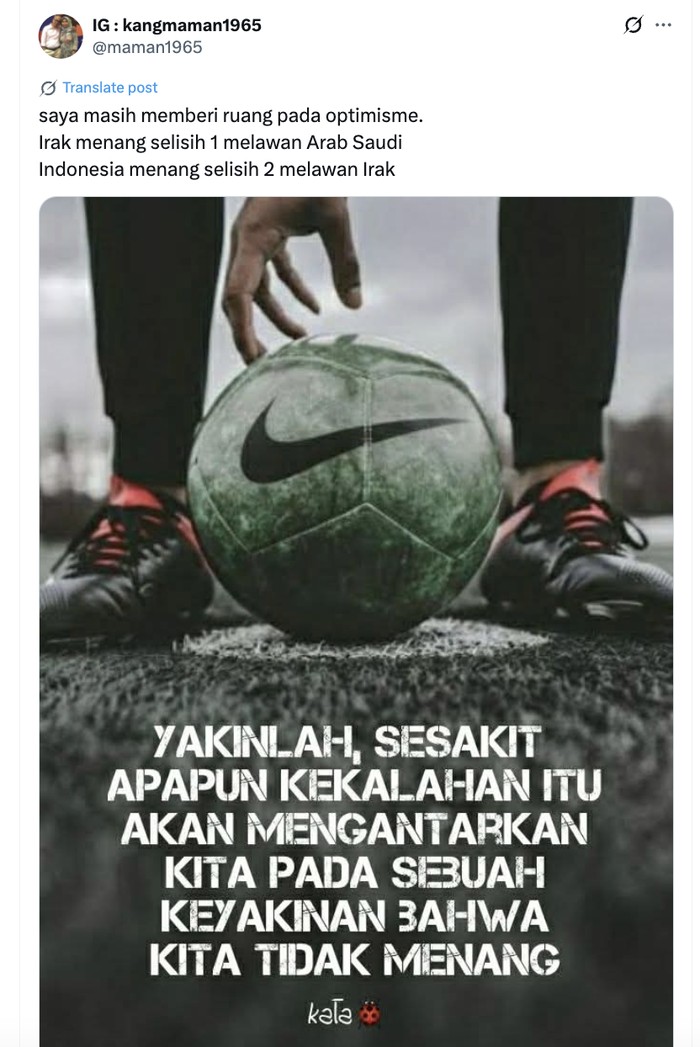 FotoINET Meme Timnas Tersungkur Hadapi Arab Saudi, Sabar Ya! Pool - detikInet Kamis, 09 Okt 2025 13:47 WIB Tautan telah disalin Jakarta - Timnas Indonesia takluk 2-3 melawan Arab Saudi. Berikut meme dan komentar mengenai pertandingan tersebut. Skor 2-3 untuk kekalahan Timnas Indonesia. Foto: X.com Akun ini membahas bahwa di masa kepelatihan Shin Tae Yong, Timnas Indonesia tak terkalahkan oleh Arab Saudi. Foto: X.com Akun ini menyoroti bahwa pemain nomor 7 seperti Marselino kerap menjadi momok bagi Arab Saudi, tapi tidak dipasang. Foto: X.com Suporter Timnas tidak mood menjalani hari ini. Foto: X.com Penampilan gemilang Maarten Paes banyak menuai pujian netizen. Foto: X.com Akun ini mengenang saat Timnas Indonesia mengalahkan Arab Saudi yang sayangnya tak terulang. Foto: X.com Jika bukan karena Maarten Paes, gawang Indonesia pasti lebih banyak kebobolan. Foto: X.com Wasit ternyata bagus memimpin pertandingan, hanya saja taktik Timnas yang dinilai kacau. Foto: X.com Patrick Kluivert pun dinilai belum meyakinkan dalam melatih Timnas. Foto: X.com Penulis Kang Maman yang tetap optimistis Timnas bisa bangkit saat melawan Irak. Foto: X.com (/) TAGS timnas indonesia vs arab saudi meme sepakbola fotoinet fotodetikcom LIHAT LAINNYA Tautan telah disalin