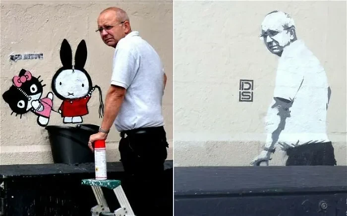 Grafiti Ds Bad Kitty dihapus, lalu orang yang menghapusnya dijadikan karya seni selanjutnya. Grafiti ini ada di Islington, London, Inggris. Foto: MarkRand via Bored Panda