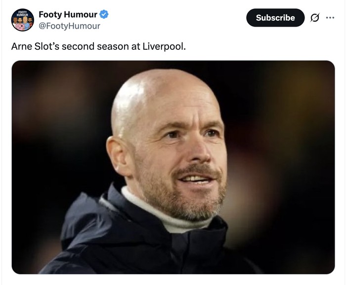 Di musim kedua bersama Liverpool, Arne Slot menjadi Ten Hag yang menyamar. Foto: X.com