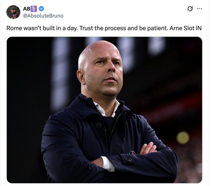 Akun ini meminta fans Liverpool untuk bersabar dengan Arne Slot. Foto: X.com
