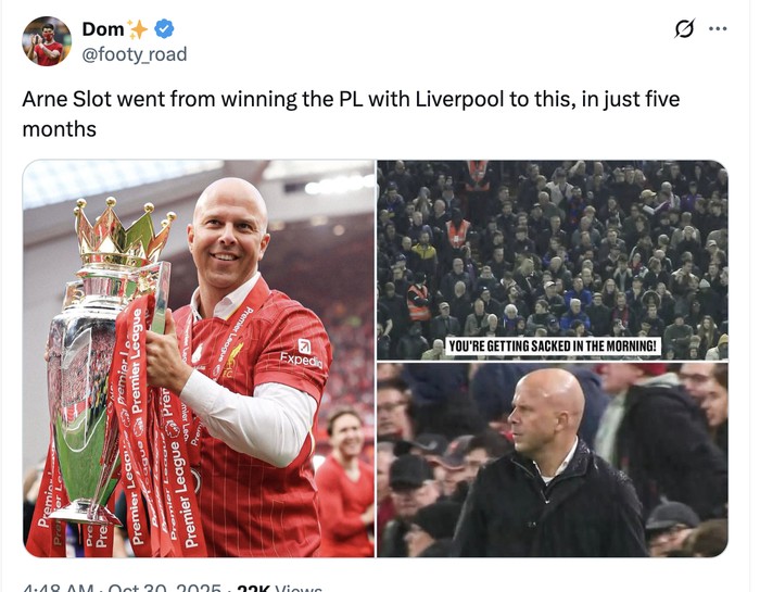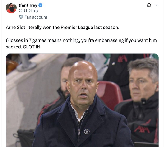 Arne Slot juara Liga Inggris musim lalu dan kalah 6 kali belum apa-apa, menurut akun ini. Foto: X.com