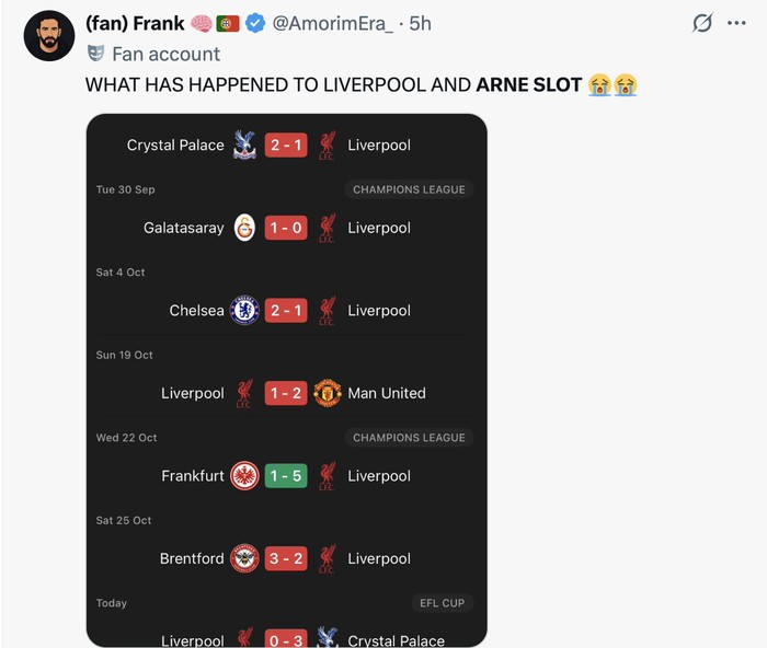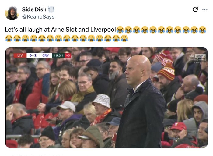 Akun ini berpendapat Arne Slot patut dipecat. Legenda Liverpool Jamie Carragher, harus menyuarakanya seperti yang pernah ia lakukan pada Ruben Amorim. Foto: X.com