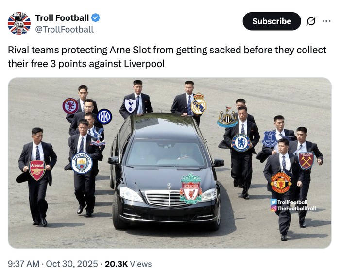 Meme tim rival melindungi Arne Slot agar tidak dipecat, supaya mereka bisa meraih 3 poin lawan Liverpool. Foto: X.com